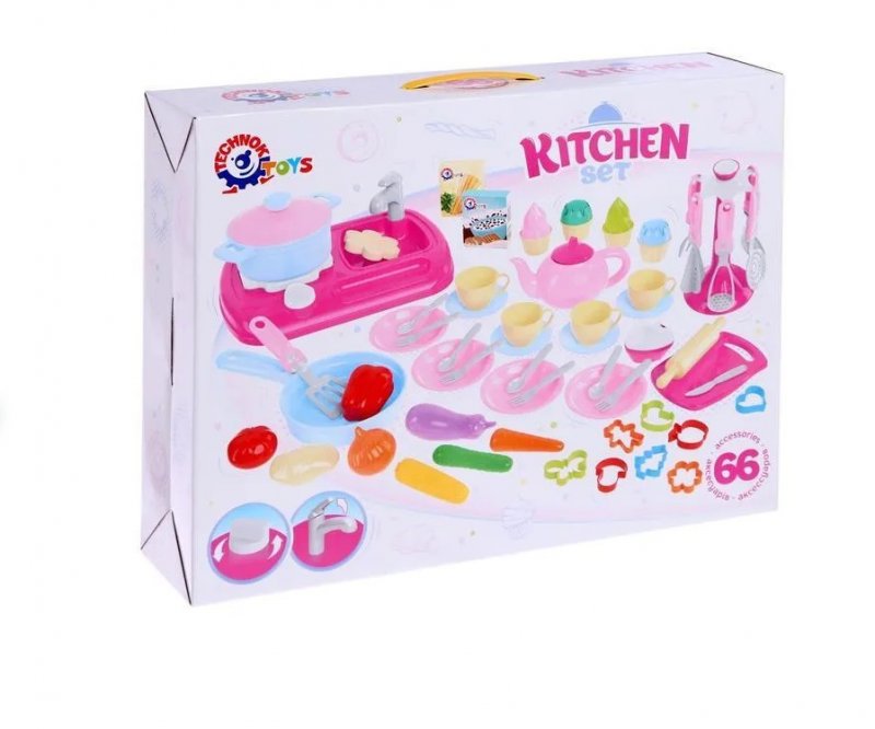 Набор посуды 66 пред. в кор. Т7280 Технок. Комплектация: 66 предметов (столешница с плитой и мойкой - 1 шт., кран - 1 шт., кастрюля - 1 шт., сковорода - 1 шт., крышка кастрюли - 1 шт., сахарница - 1 шт., крышка сахарницы - 1 шт., чайник - 1 шт., крышка чайника - 1 шт., ложка - 4 шт., вилка - 4 шт., нож - 1 шт., тарелка - 4 шт., чашка - 4 шт., блюдце - 4 шт., формочки разных размеров - 16 шт., овощи (огурец, морковь, баклажан, помидор, картофель, лук, кукуруза, перец) - 8 шт., коробочка - 2 шт., стойка для приборов - 1 шт., половник - 1 шт., шумовка - 1 шт., вилка большая - 1 шт., лопатка - 1 шт., венчик - 1 шт., толкушка - 1 шт., доска разделочная - 1 шт., скалка - 1 шт., губка - 1 шт.