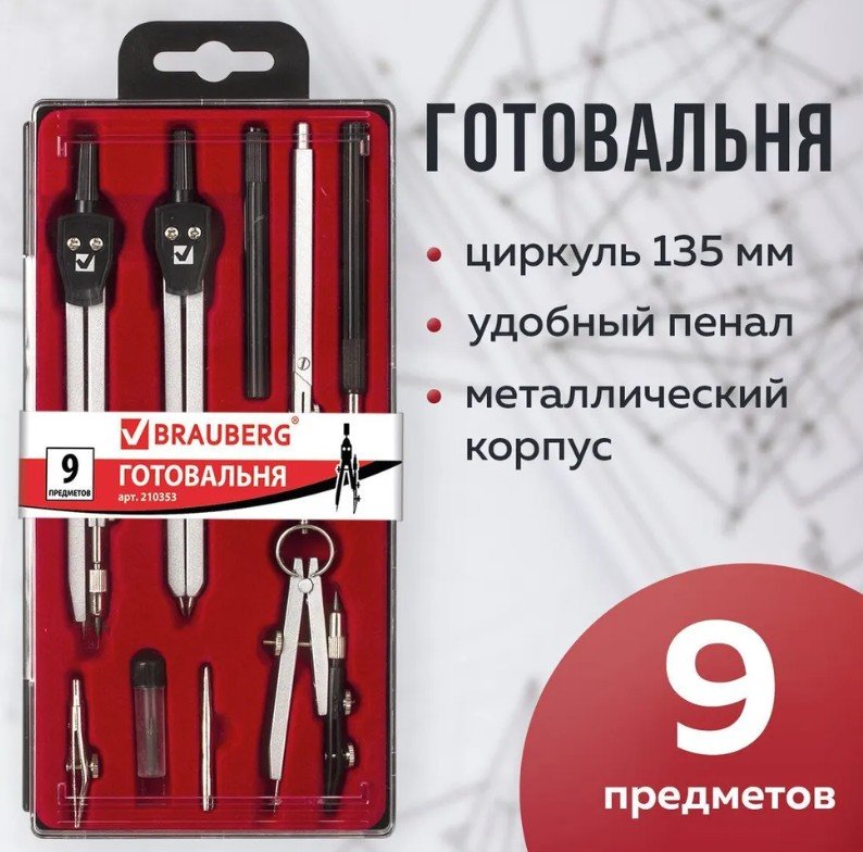 Готовальня BRAUBERG "Architect", 9 предм: циркуль+измерит+кронц-ль,рейсф+держ,удлинит,грифель,210353