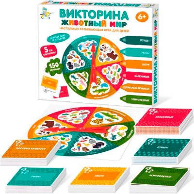 В настольную игру-викторину «Животный мир» можно играть с друзьями! Она развивает эрудицию, мышление, расширяет кругозор. Состав игры: • картонное игровое поле с пластиковой стрелкой и 6 секторами (20*20 см) • картонные карточки с вопросами – 150 шт. (6,5*4,5 см) Игра предназначена для детей старше 6 лет и рассчитана на 2–4 игроков. Как играть? Перед началом игры нужно разделить карточки по темам, сложить стопками текстом вниз и выбрать ведущего, который будет зачитывать вопросы. Если игра проходит без ведущего, то вопросы друг другу зачитывают игроки. Внимание! Правильные ответы указаны в карточках в скобках. Игровое поле разделено на 6 секторов по темам вопросов. Первый игрок крутит стрелку, и ведущий берет первую карточку из выпавшей темы. В каждой карточке два вопроса. Если игрок правильно ответит на оба вопроса, то он оставляет карточку себе. Ход переходит к следующему игроку. Если игрок не ответил на один или оба вопроса, то карточку кладут обратно, в низ стопки, а ход переходит к следующему игроку.