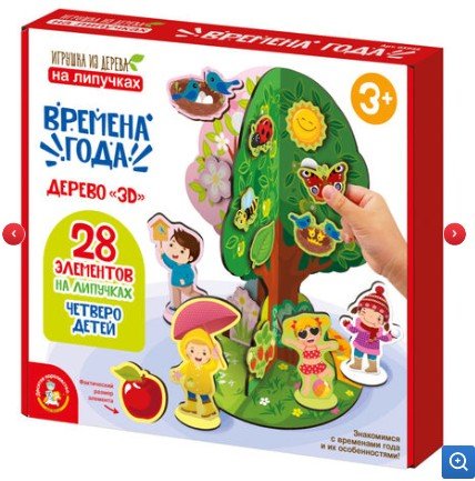 В комплект входят 28 красочных элементов, представляющих собой листву, цветы, плоды, снежинки и другие характерные атрибуты каждого времени года. С их помощью ребенок сможет самостоятельно "украшать" дерево, создавая реалистичные картины весны, лета, осени и зимы.