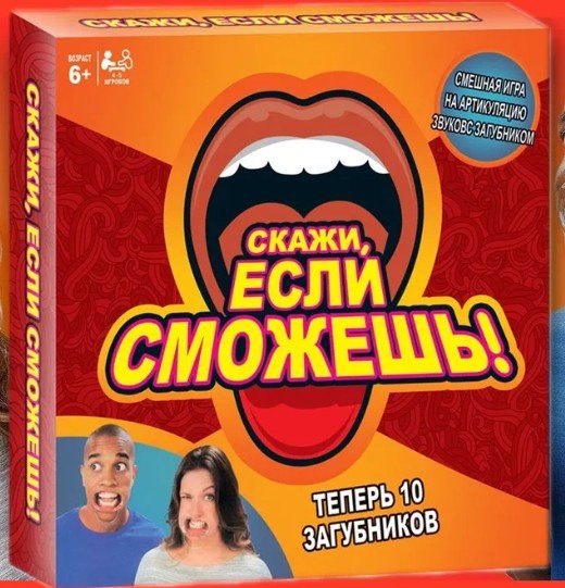 Настольная игра Скажи если сможешь - это НЕВЕРОЯТНО смешная игра, которая однозначно поднимет настроение до небес всем друзьям и даже самому грустному члену компании. Мы гарантируем, что смеяться до слез будет каждый! Правила игры попробуй произнести просты: игроки делятся на команды и поочереди пытаются произнести фразы с загубником и выполняют попавшееся задание. Только представьте своих друзей или родителей в загубниках, которые сквозь слезы от смеха пытаются произнести хоть одно внятное слово! Смешно даже без слов. Игра идеально подходит для вечеринок и домашних посиделок. В комплект игры входят 10 гипоаллергенных загубников, 200 карточек специально труднопроизносимых фраз, песочные часы. Настольные игры такие как скажи если сможешь, алиас, уно, дженга, монополия это прекрасный подарок на любой праздник. Развлекательная настольная игра для компании попробуй произнеси не оставит равнодушным никого.